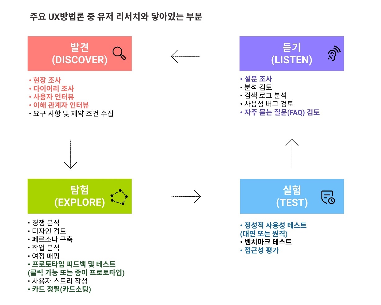 * 컬러로 표기된 방법이 아니더라도 간접적으로 유저 리서치와 닿아있는 방법들도 존재